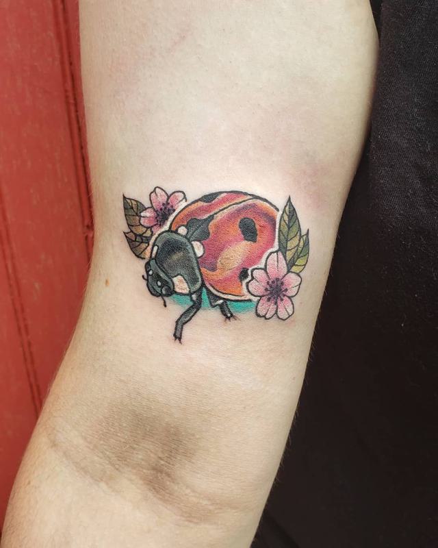 Neo-traditional ladybug tattoo expands on American-traditional styles to include more options for line widths, a broader color palette, and more depth of dimension. The tattoos pay homage to classic themes born out of ports, military schools, and harbors worldwide, updating them but not completely changing Traditional motifs.