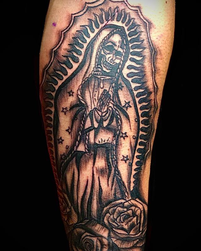 The black and grey Santa Muerte tattoo gives you that vintage look with much info on your skin. It suits people who want to ink large areas of their body and won’t be afraid to show off the lady’s face or skeleton.