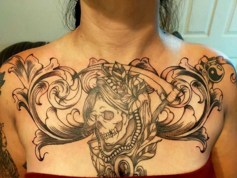 Like the back, your chest gives you much freedom to say more about what Santa Muerte means to you. This location mostly favors men as they’ll have more space to ink their skins. Your tattoo can have loads of details and will need more time and money, but if the artist does it well, you’ll love it.
